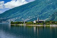 Uitzicht op het Comomeer vanuit Gravedona vanuit een hotel aan het strand.