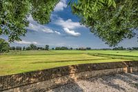 Zicht op het Friese land met de pas gemaaide grasvelden vanaf de terp van Tsjerkebuorren op een fraaie zomerse dag.