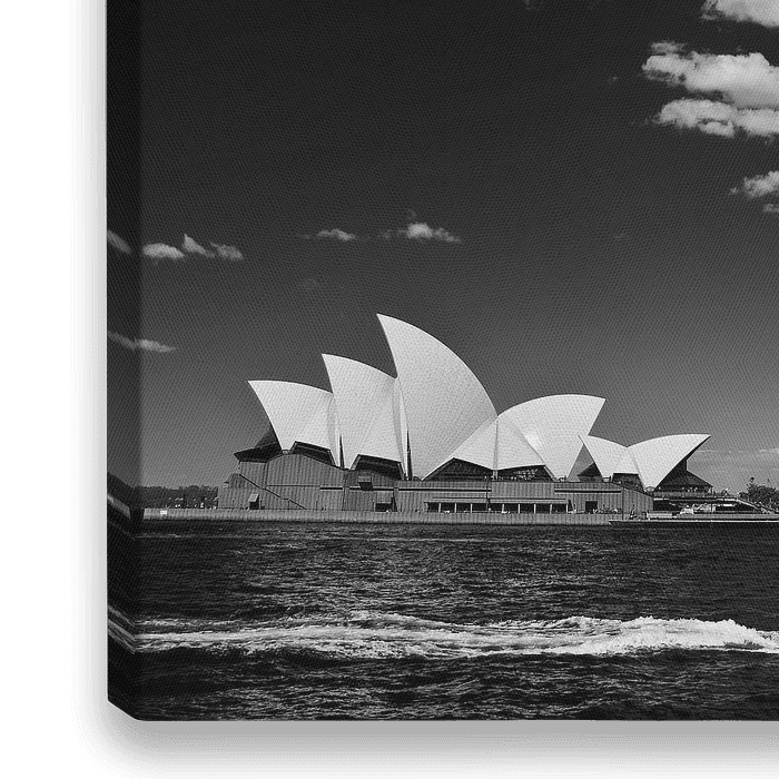 Het Sydney opera huis in zwart wit gefotografeerd. De wolken steken goed af tegen de donkere lucht. Op de voorgrond is een boot te zien. Door de combinatie van de wolken, het gebouw en de boot krijgt de foto een modern uitstraling.