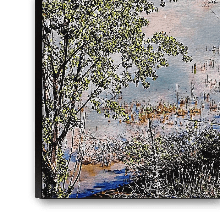 Dit is een fotokunstbeeld van het Lago Trasimeno (meer van Trasimeno) dat neerkijkt op het dorpje Braccio in Umbrië, Italië. Het beeld heeft een aquareleffect. Het meer is het grootste van Midden-Italië en het vierde grootste van het land na het Comomeer. Het is echter maar zes meter diep, dus vaaractiviteiten zijn beperkt. Hier is er een vredig uitzicht door de bomen naar de verre oever van het meer.