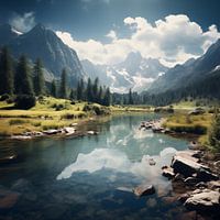 Uitzicht op het bergmeer schilderij is een adembenemend kunstwerk dat de serene schoonheid van een berglandschap in volle glorie vastlegt. Het schilderij toont een rustig meer omringd door imposante bergen, waarbij het spiegelende water de kleuren van de lucht en het omliggende landschap subtiel weerkaatst. De combinatie van realistische details en een zachte, sfeervolle uitstraling zorgt voor een harmonieus geheel dat rust en inspiratie uitstraalt.