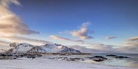Uitzicht op het eiland Gimsoya in de Lofoten in Noord-Noorwegen tijdens een mooie winterdag met een blauwe lucht boven het eiland in de archipel.