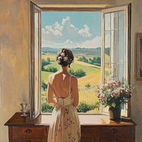 Een zacht briesje stroomt door het open raam en benadrukt de magische vrijheid van het landschap. De vrouw in haar bloemetjesjurk, met delicate bloemen in haar haar, opent haar hart voor de weidse, zonovergoten velden. Op de achtergrond drijven pluizige wolken door de helderblauwe lucht, wat het moment een dromerige lichtheid geeft.
