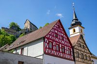 Uitzicht op het kasteel met kerk in Pottenstein in Frankisch Zwitserland, Beieren