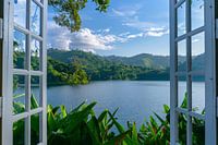 Koop dit landschapskunstwerk Uitzicht op het meer door het raam van Poster Art Shop op canvas, aluminium dibond, (ingelijste) fotoprint, behang en ArtFrame, op maat geprint in Fine-Art kwaliteit.