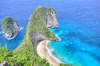 Deze schitterende muurschildering toont Kelingking Beach op Nusa Penida in wat waarschijnlijk de meest indrukwekkende kleurencompositie is. De opvallende rotspartij, die als de rug van een groene dinosaurus uitsteekt in de turquoise zee, is een iconisch motief voor ansichtkaarten - hier vastgelegd in bijzonder helder licht. Het fijne zandstrand ligt beschut in een halvemaanvormige baai, omlijst door steile kliffen en het eindeloze blauw van de Indische Oceaan.