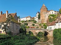 Op de voorgrond een middeleeuwse toegangsbrug over het riviertje le Armançon met daarnaast een allerschattigst huisje. Dominant in beeld prijkt de Tour de l'Orle d'Or, een van de vele typerende torens waar het vestingstadje mee vol staat. Achter in beeld, boven op de berg, het Hôtel de Chassey.