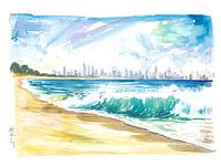 Uitzicht op het strand van New Jersey met beukende golven en de skyline van Manhattan