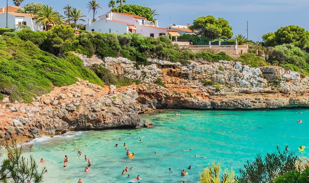 Gezicht op het strand van de baai van Cala Anguila op Mallorca, Spanje Middellandse Zee, Mallorca, Balearen, Balearen, Middellandse Zee, Spanje