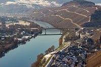 Gezicht op het winterse Moezeldal tussen Lieser en Mülheim met de Moezelbrug in Mülheim en besneeuwde bergen op de achtergrond