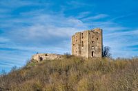 Uitzicht op Kasteel Arnstein in de winter met donkere wolken in de lucht