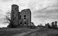 Uitzicht op Kasteel Arnstein in de winter met donkere wolken in de lucht