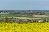 Bloeiende koolzaad velden met uitzicht op kerkdorp Vijlen in Zuid-Limburg
