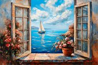 Uitnodigende raamkozijnen bieden uitzicht op het glinsterende, azuurblauwe water waarin zachte golven dansen. Zeilboten glijden majestueus voorbij, terwijl weelderige bloemen in een terracotta pot het landschap verlevendigen. De wolken lijken verhalen te vertellen van verre reizen, terwijl de zon teder schijnt op het vredige landschap. Een droom van vrijheid en schoonheid.