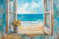 Een zachte druk vanuit de verte, waar het heldere blauw van de zee het warme goud van het zand ontmoet. De luiken staan wijd open, alsof ze uitnodigen tot een zilte bries. Een delicaat boeket bloemen in een vaas straalt levendigheid uit en harmonieert met de rustige idylle van dit dromerige kustzicht.