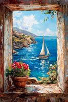 Een schilderachtig raam opent naar een idyllisch kustlandschap, waar een trotse zeilboot zachtjes door de golven snijdt. Felrode bloemen in een kleipot geven het tafereel een vleugje joie de vivre, terwijl de helderblauwe zee en heldere lucht een zorgeloze sfeer creëren die uitnodigt om te dromen.