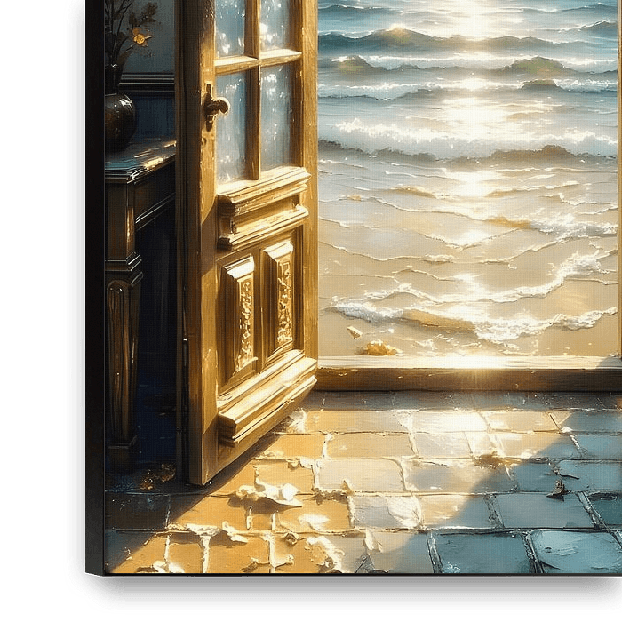 Een open deur biedt uitzicht op de zee en het strand. Licht, horizon en uitgestrektheid smelten samen tot een kalm, uitnodigend tafereel dat fungeert als een drempel van het alledaagse leven naar ontspanning.
