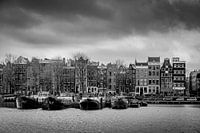Uitzicht op de Prins Hendrikkade te Amsterdam. De foto is gemaakt op een stormachtige dag in de hoofdstad. Ik heb gekozen voor een zwart wit bewerking. Dit versterkt de wolkenpartij en het licht vallend op de grachtenpanden en woonboten.