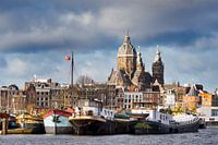 Uitzicht over Amsterdam op een stormachtige dag. Op de foto zie je de Basiliek van de Heilige Nicolaas met daarvoor grachtenpanden en Amsterdamse woonboten. Heel even kwam de zon tevoorschijn, en scheen ze op dit uitzicht van Amsterdam. Doordat het stormachtig was kwamen er prachtige wolken partijen tevoorschijn, en wapperde de…