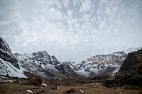 Uitzicht over het kamp van Annapurna Basecamp. Schapenwolken bedekken de hemel. Bruin wit. Nepalese vlaggen in de verte. Lichte laag sneeuw bedekt de bruin geworden bergen.