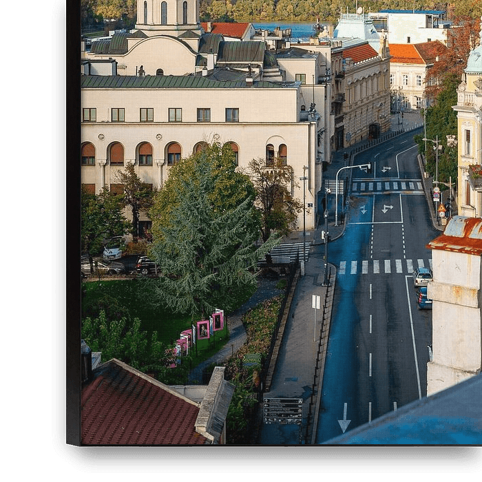 Uitzicht over een straat en de Sint-Michielskathedraal in Belgrado op een dag in de herfst