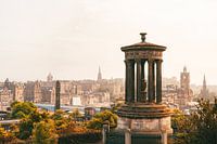 Uitzicht over Edinburgh in het avond zonlicht. Vanaf Calton Hill kijk je uit over de oude stad in Schotland. Het torentje met de pilaren is het Dugald Stewart Monument, ter ere van een Schotse filosoof.
