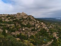 Gezicht op het bergdorp Gordes in het Luberongebergte in de Provence in het zuiden van Frankrijk met historische gebouwen en ruige kliffen omgeven door groene vegetatie op een bewolkte dag in de herfst.