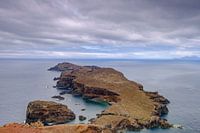 Uitzicht over Ilheu da Cevada vanaf Ponta do Furado op het schiereiland Ponta de São Lourenço aan de oostkant van het eiland Madeira tijdens een bewolkte zomerdag. De kliffen rijzen op uit de Atlantische Oceaan.