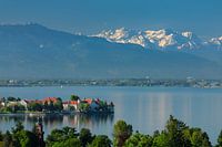 Uitzicht over Lindau naar het Bodenmeer en de Alpen