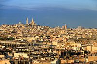 Prachtige opname van het uitzicht over Parijs, Frankrijk, gezien vanaf de Arc de Triomphe kijkend naar oa de Sacre-Coeur basiliek aan het einde van de middag in de lente met mooi zonlicht