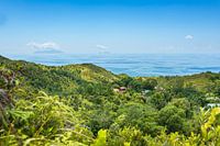 Uitzicht over een idyllische nederzetting op het eiland Praslin naar Silhouette en Noordereiland