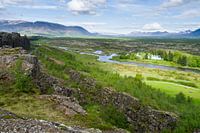 Het beroemde uitzicht over het nationaal park Thingvellir. Ik had het geluk dat de zon even door de wolken brak en precies de gebouwen verlichte. Enkele seconden later was het licht weer weg.