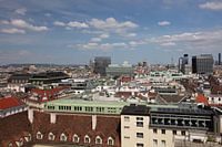 Uitzicht over Wenen, Oostenrijk, in kleur, van de Stephansdom tot de skyline op een zonnige lentedag