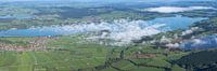 De Hopfensee glinstert in de jonge dag, een spiegel van de hemel verloren in delicate sluiers van mist. De Forggensee strekt zich ernaast uit, wijd en stil, alsof het het ritme van de aarde zelf ademt. En verder naar het westen, omarmd door bossen en weiden, slaapt de Bannwaldsee - een verborgen oog dat de wolken aantrekt en weer loslaat.