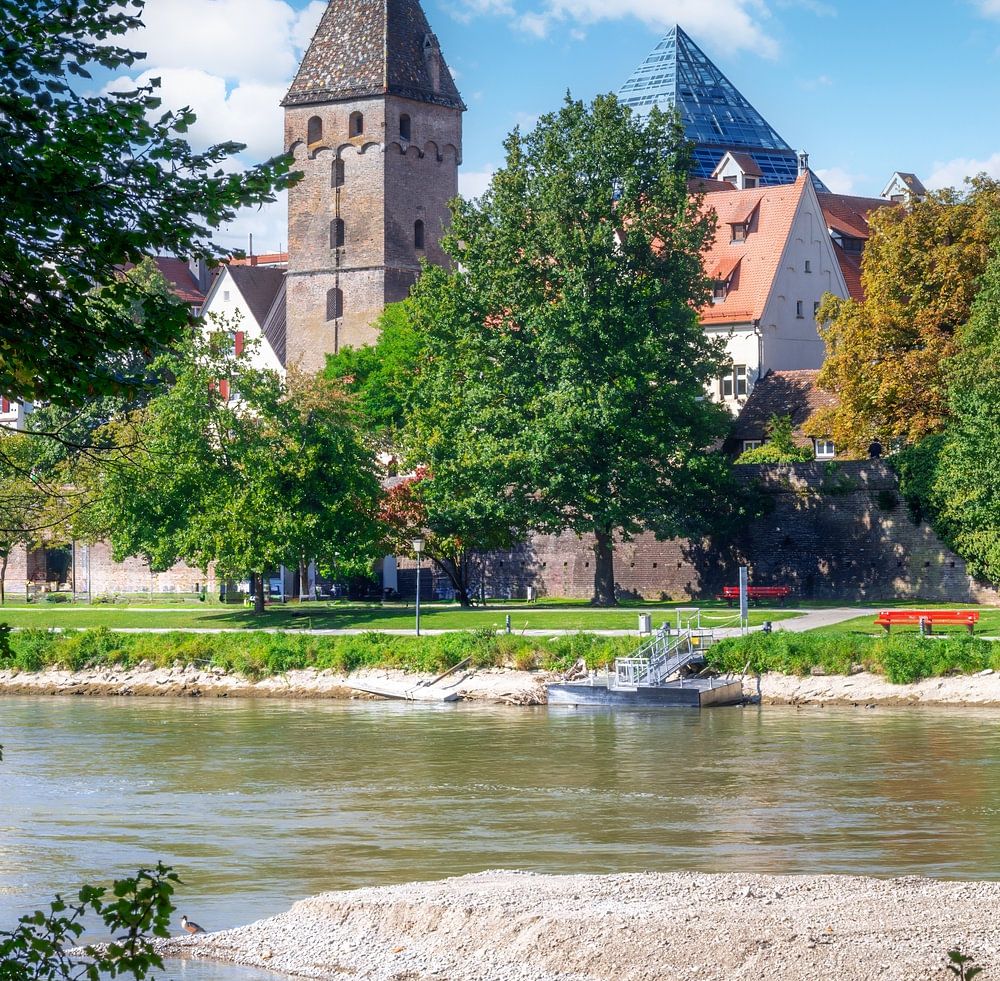 Uitzicht over de Donau naar de historische Metzgerturm in Ulm