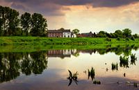 De Maas is een rivier die gedeeltelijk loopt langs de Nederlands-Belgische grens. Om de doorvaart van schepen te vergemakkelijken is een deel van de rivier ontlast door een kanaal. In dit deel zien we een rustig rivierlandschap met reflecties op het water. We kijken hier van nederland naar belgië aan de overkant.