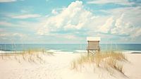Op deze serene afbeelding staat een eenvoudig strandwachthuisje op een zandduin, met uitzicht op de uitgestrekte noordzee. Het witte zand lijkt bijna te versmelten met de heldere lucht, terwijl de wilde grassen zachtjes buigen in de zeewind.