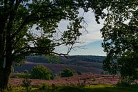 Uitzicht over de bloeiende heide op de Posbank in Nationaal Park de Veluwezoom nabij Arnhem. Het uitzicht wordt natuurlijk omlijst door Eikenbomen.