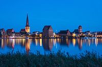 Uitzicht over de rivier de Warnow naar de Hanzestad Rostock op het blauwe uur.
