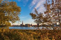 Uitzicht over de Warnow naar de Hanzestad Rostock in de avond.