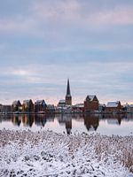 Uitzicht over de rivier de Warnow naar de Hanzestad Rostock in de winter.