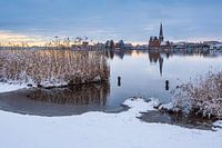 Uitzicht over de rivier de Warnow naar de Hanzestad Rostock in de winter.