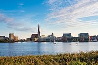 Uitzicht over de Warnow rivier naar de Hanzestad Rostock.