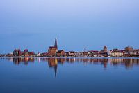 Uitzicht over de Warnow rivier naar de stad Rostock in de avond.