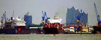Een uitzicht over de Elbe naar de Philharmonie als digitaal olieverfschilderij