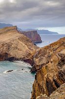 Uitzicht over de kliffen van het schiereiland Ponta de São Lourenço aan de oostkant van het eiland Madeira tijdens een bewolkte zomerdag. De kliffen rijzen op uit de Atlantische Oceaan.