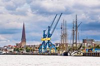 Uitzicht over de rivier de Warnow naar de Hanzestad Rostock.