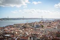 Een fantastisch uitzicht over de mooie stad Lissabon met de kenmerkende brug, Ponte 25 de Abril dievover de rivier de Taag ligt. In de verte is ook het grote beeld van Jezus te zien.