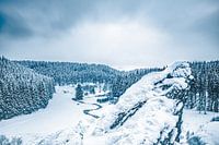 Uitzicht vanaf Rocher du Bieley in het Waalse Bütgenbach nabij de Duitse grens. Deze rots staat ook wel bekend als Bieley Felsen. Vanaf dit uitkijkpunt heb je een prachtig uitzicht over de vallei en de meanderende rivier beneden. Deze foto werd genomen tijdens de winter na een flinke sneeuwbui en zorgt voor een mooi sneeuwtapijt en…