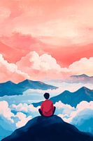 In zachte pastelkleuren smelten de lucht en de bergen samen tot een dromerig panorama waarin een stille toeschouwer in de verte staart. De harmonieuze combinatie van kleuren en de rustige compositie nodigen uit tot dagdromen. Dit kunstwerk is perfect voor de slaapkamer en creëert een sfeer van ontspanning en zelfreflectie.